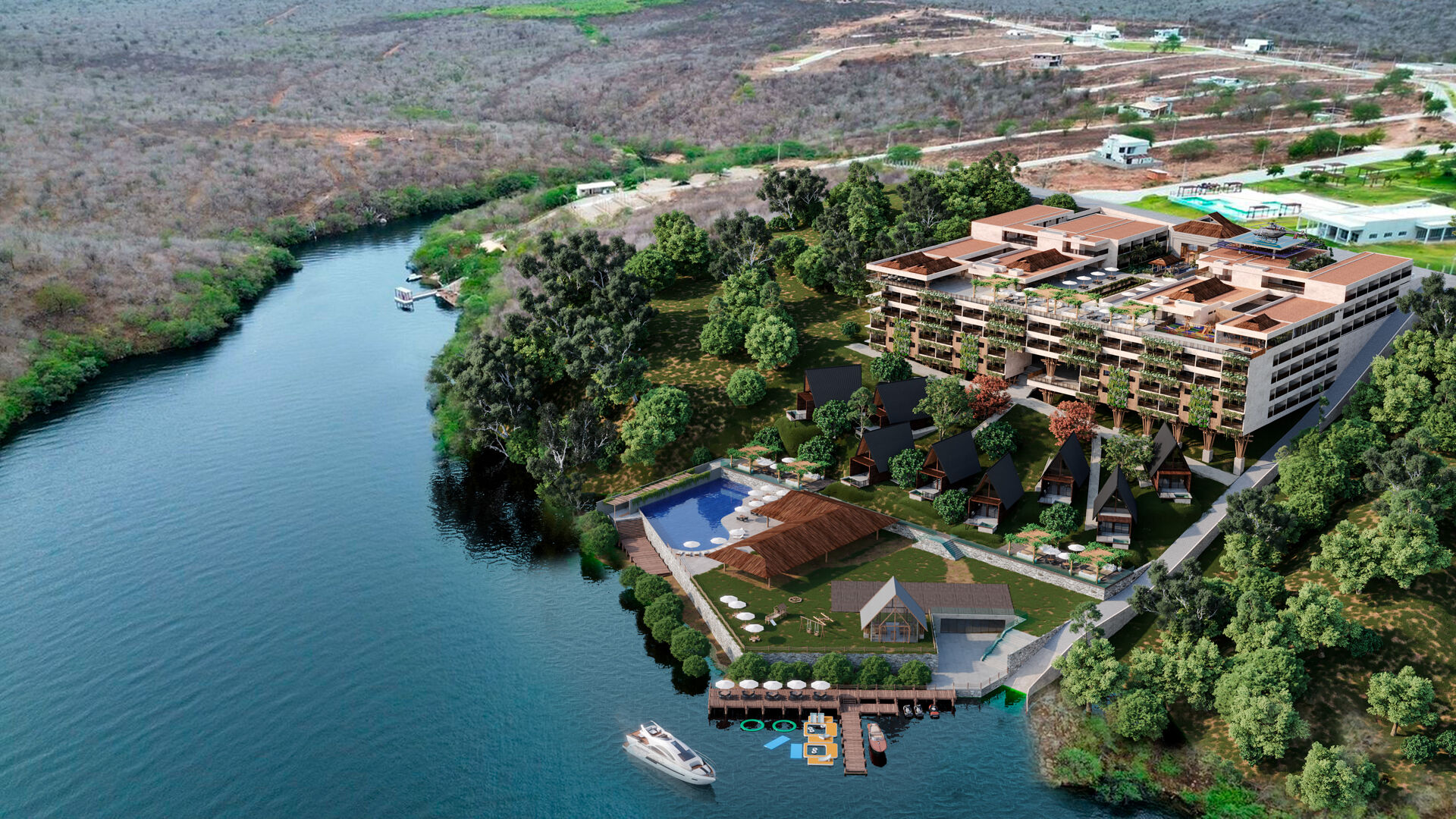 São 268 unidades residenciais entre studios, apartamentos e chalés, todos projetados para oferecer conforto e vistas deslumbrantes. A infraestrutura é completa e inclui marina privativa, heliponto, piscinas (inclusive uma flutuante no Velho Chico), restaurante, spa, quadras esportivas e serviços premium como concierge 24h.